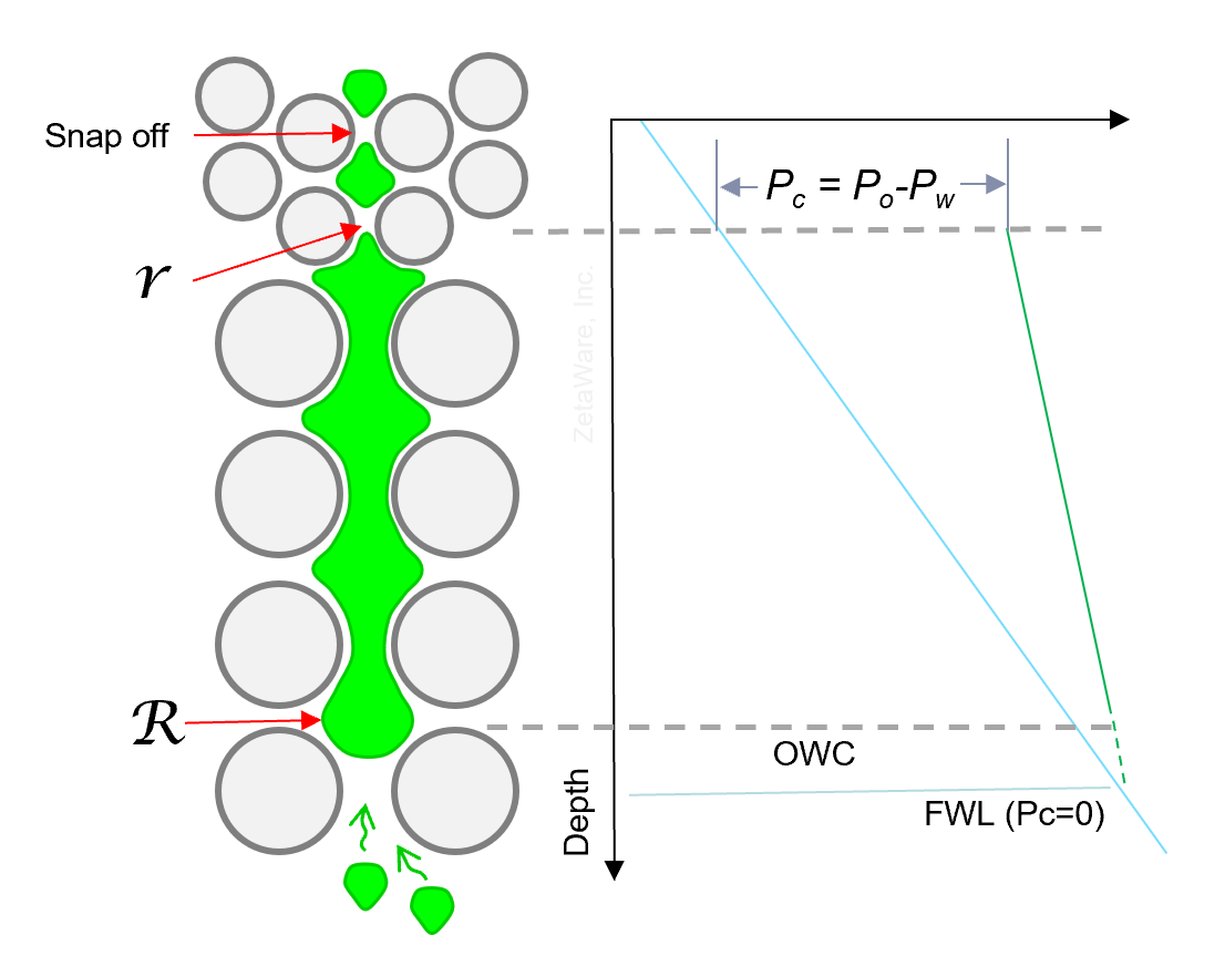 Near the top of the reservoir, buoyancy (= capillary pressure) pushes oil into smaller pore spaces and corners resulting in higher oil saturation. Near the bottom of the column, buoyancy is low, so oil is only in the large pore space, and thus oil saturation is low. Buoyancy force is transformed into capillary pressure (Pc = Po – Pw), which is what pushes the oil into smaller pores. It is a form of potential energy. |