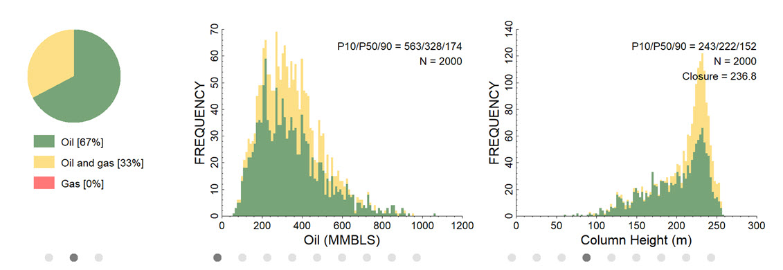 In our PSA toolkit, Trinity 3D, we use a probabilistic method to make predictions about the seal capacity / column height, in single and dual phase (gas cap and oil leg) conditions as well as volumes and fluid properties.